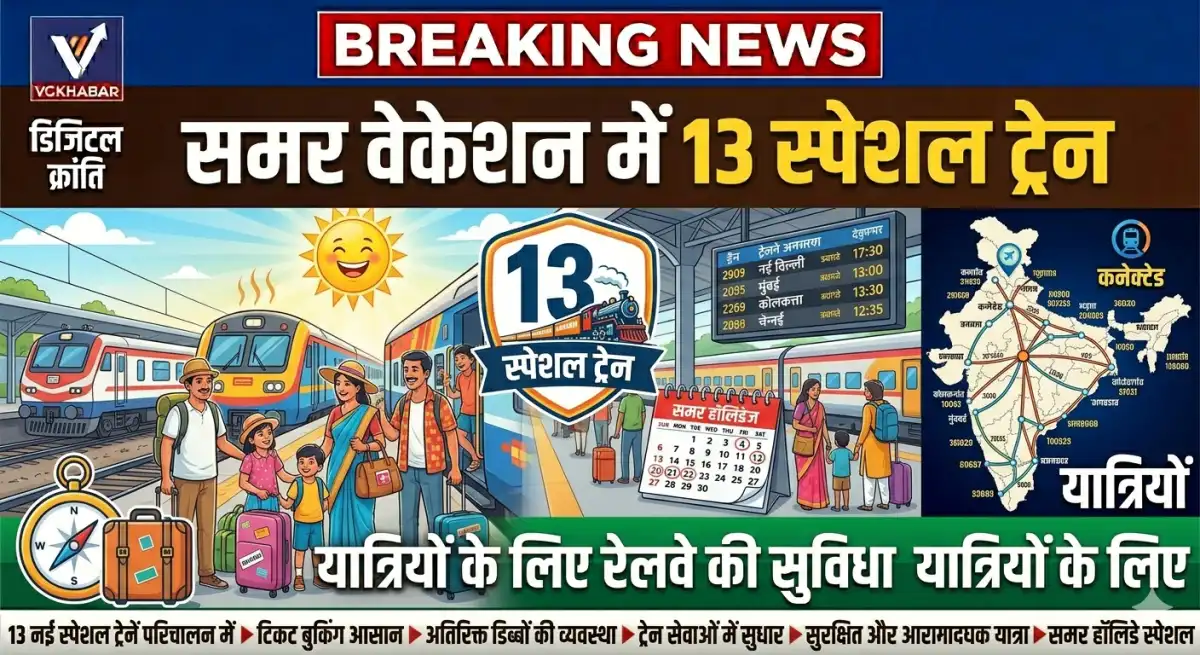 रेलवे ने गर्मी की छुट्टियों के दौरान यात्रियों की बढ़ती मांग को देखते हुए 13 स्पेशल ट्रेनों के संचालन की घोषणा की है। ये ट्रेनें प्रमुख रूटों पर चलाई जाएंगी, जहां यात्रियों की संख्या अधिक रहती है।